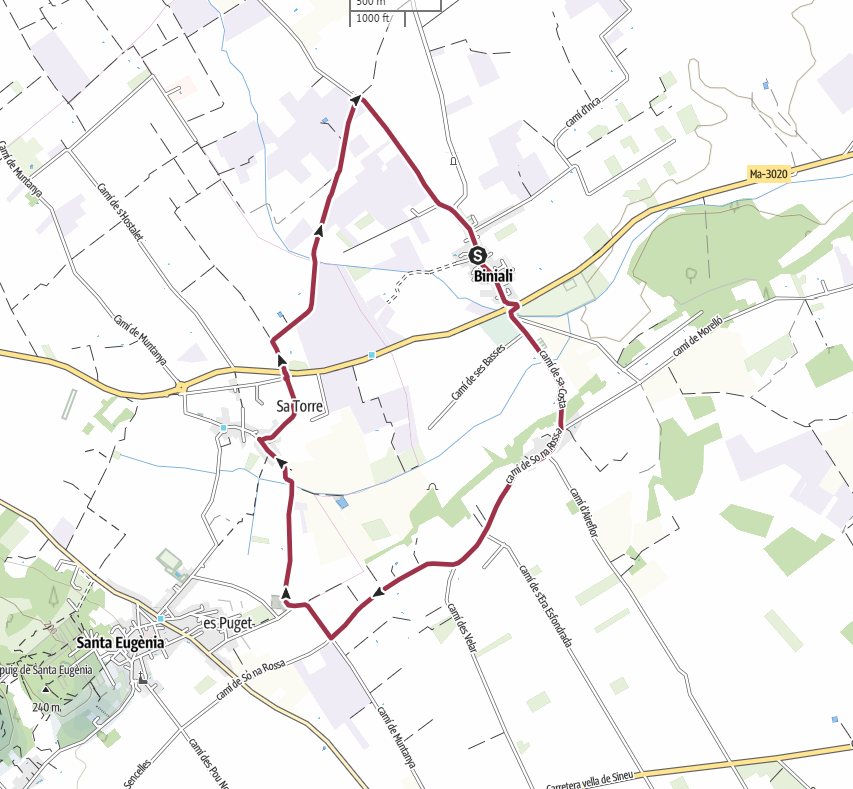 Biniali frontereja amb el terme de Santa Eugènia, una comarca amarada per la història de dues alqueries: Sonarossa i sa Torre. Ambdues duen en la seva pell la pàtina de l’antigor, el pes d’una cronologia que s’endinsa en els albirs de l’època medieval. Al voltant de la primera nasqué un petit nucli, dispers i amable, mentre que a la segona, paret amb paret, s’arrenglera la trama urbana de ses Alqueries, un dels llogarets de Santa Eugènia. La ruta de més a més tresca per vies històriques que han marcat no sols l’esdevenir de la contrada sinó de tota l’illa. Basta anomenar-ne dos: el camí de Sonarrossa i el camí de Consell.